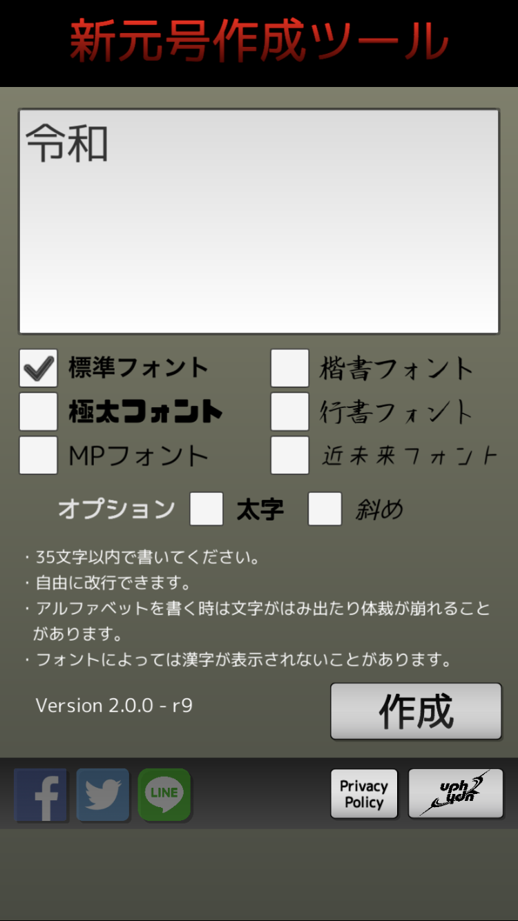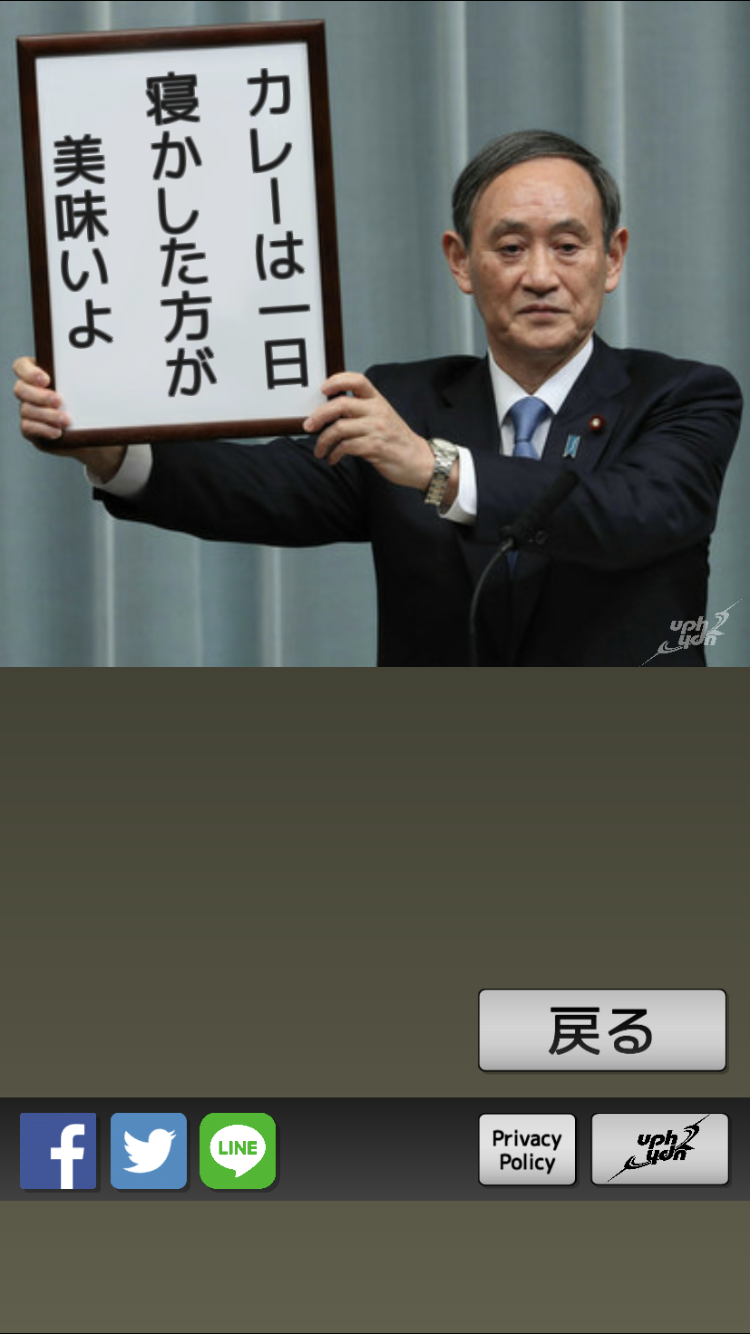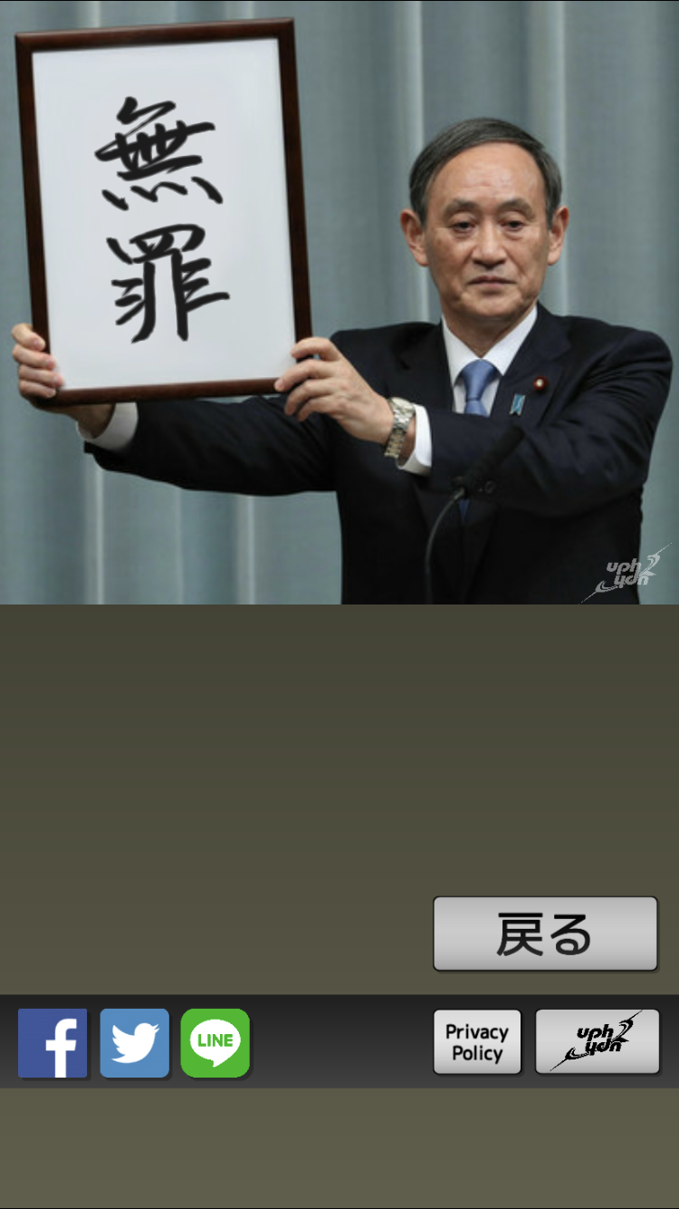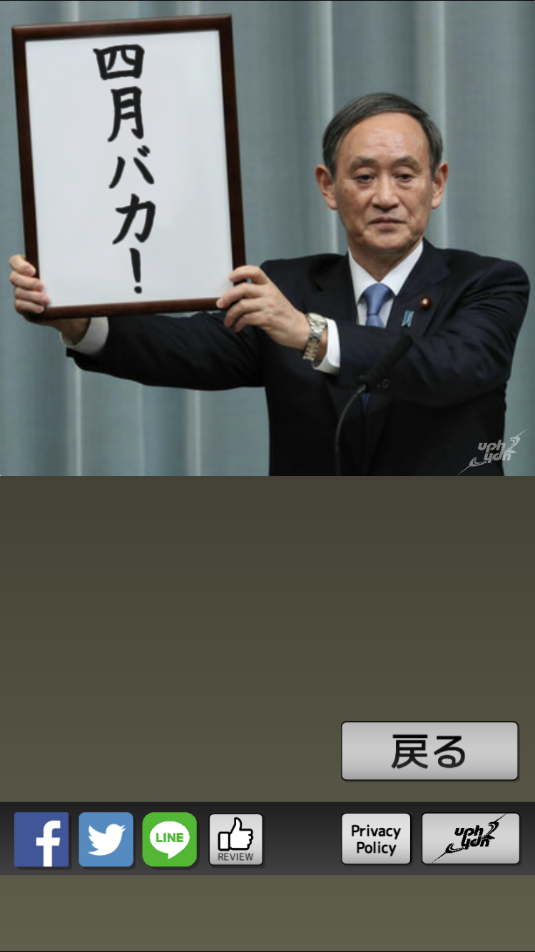 uphydnリリース第六弾! - 今までこのようなアプリがあっただろうか?いや結構みんなやってる。(地元民談) 自分オリジナルの新元号を作成して発表してみましょう! 35文字以内で新元号を入力してください。 官房長官が新元号を掲げて発表を行います。(令和発表コラージュです) 新元号の発表シーンの写真はFacebook、Twitter、LINE、InstagramなどのSNSに送信できます。 面白い(?)元号やクールな元号を考えてみんなにシェアしましょう! (※)新元号じゃなくても適当な台詞で遊べます。